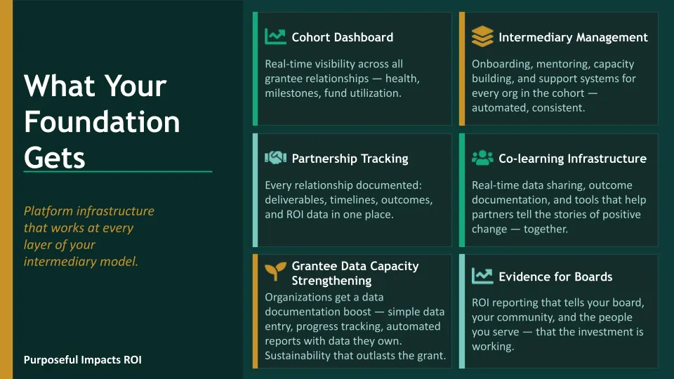 Every new grantee cohort gets their own portal duplicated in minutes. One methodology. One system. Consistent co-learning infrastructure across every partnership you manage